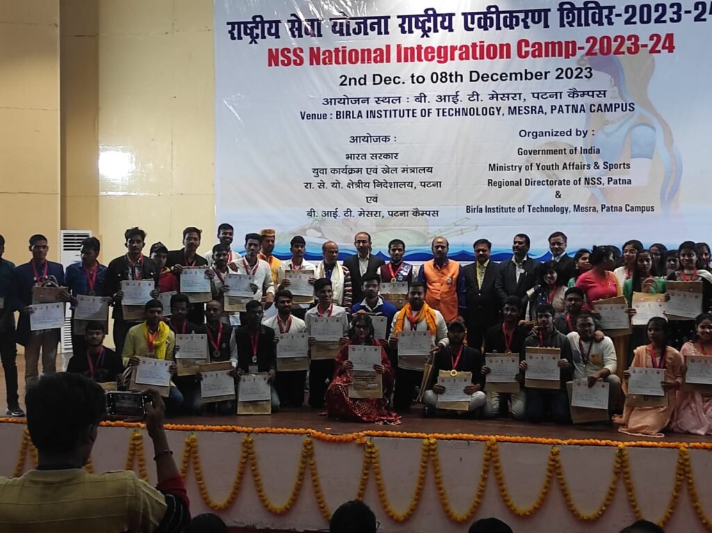 पटना. राष्ट्रीय सेवा योजना, युवा कार्यक्रम एवं खेल मंत्रालय, भारत सरकार, बिहार क्षेत्र, पटना के द्वारा बीआईटी मेसरा पटना में आयोजित राष्ट्रीय एकीकरण शिविर का समापन हुआ. बिहार टीम के कार्यक्रम पदाधिकारी डॉ त्रिलोक झा सहित बारह को क्षेत्रीय निदेशक गिरधर उपाध्याय ने एनएसएस पदक एवं प्रशस्ति पत्र देकर सम्मानित किया.
