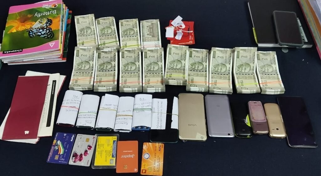 पास से 6.51 लाख नकद,15 एंड्राइड मोबाइल फोन कई बैंक के डेबिट कार्ड, एक कंट्री मेड पिस्टल व दस कारतूस बरामद