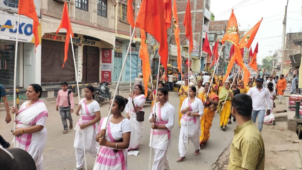 डुमरांव. पहली बार राष्ट्र सेविका समिति के बहनों द्वारा पथ संचलन निकालने का निर्णय लिया गया और शुक्रवार को सभी बहनें कदम से कदम मिलाकर भारत माता की जय, वंदे मातरम की जय घोष के साथ सड़कों पर उतरी. इसलिए कहां जाता है कि स्त्री राष्ट्र की आधारशिला है.