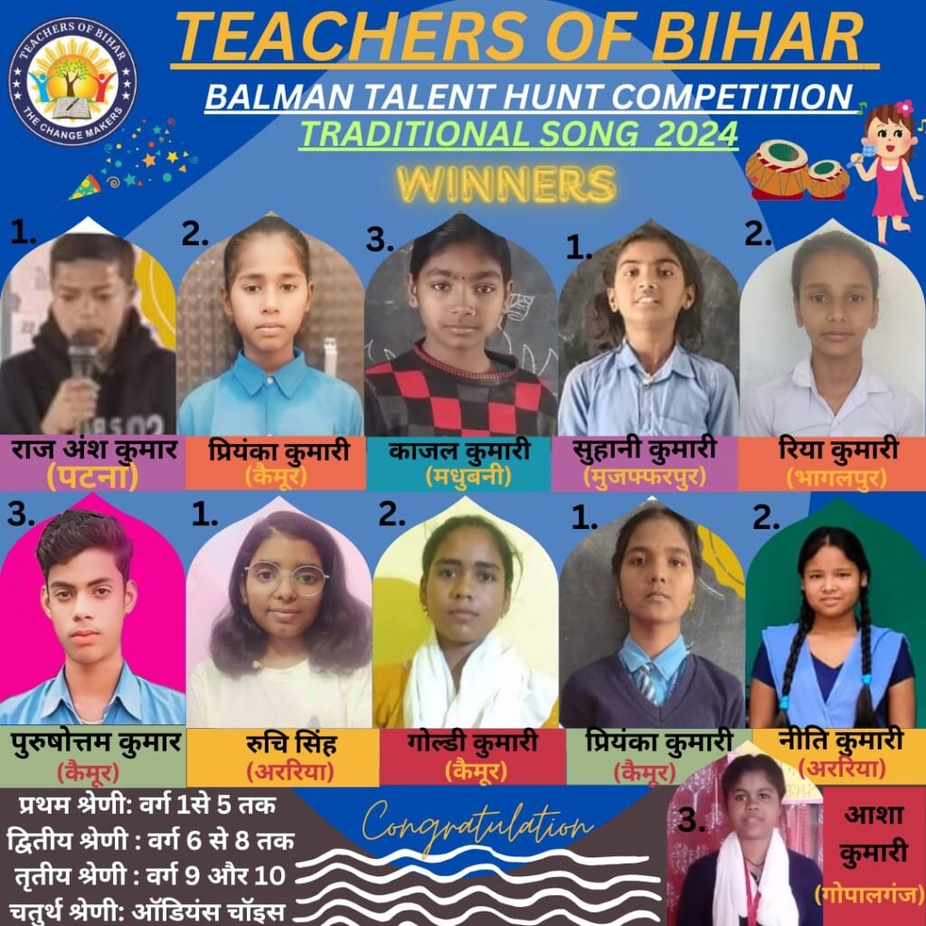 विजेता प्रतिभागियों में पारंपरिक लोक गीत के लिए वर्ग 1 से 5 में प्राथमिक विद्यालय बड़की बलियारी विक्रम पटना के छात्र रजनीश कुमार को प्रथम स्थान, उत्क्रमित उच्चतर माध्यमिक विद्यालय कोटा, नुआव, कैमूर की छात्रा प्रियंका कुमारी को दूसरा स्थान और मध्य विद्यालय रांटी, राजनगर, मधुबनी की छात्रा काजल कुमारी को तीसरा स्थान प्राप्त हुआ।