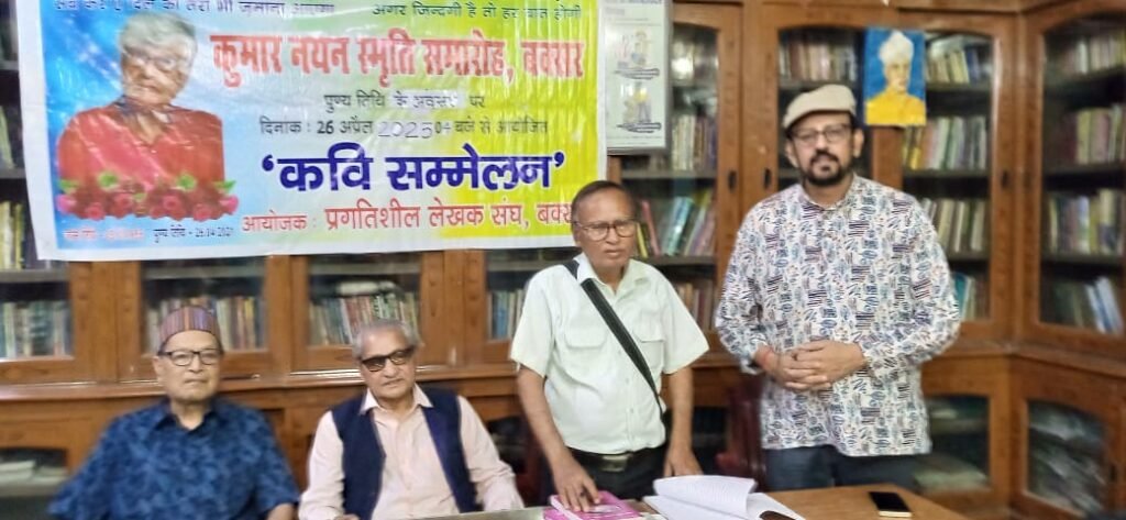 बक्सर। प्रगतिशील लेखक संघ (प्रलेस) बक्सर इकाई के तत्वावधान में आज स्थानीय ज्योतिप्रकाश लाइब्रेरी सभागार में प्रसिद्ध शायर और समाजसेवी कुमार नयन की चौथी पुण्यतिथि पर एक कवि सम्मेलन का आयोजन किया गया। समारोह की अध्यक्षता वरिष्ठ साहित्यकार रामेश्वर प्रसाद वर्मा ने की तथा संचालन डॉ. बी.एल. प्रवीण ने किया। आयोजन का संयोजन अनुराग कुमार द्वारा किया गया।