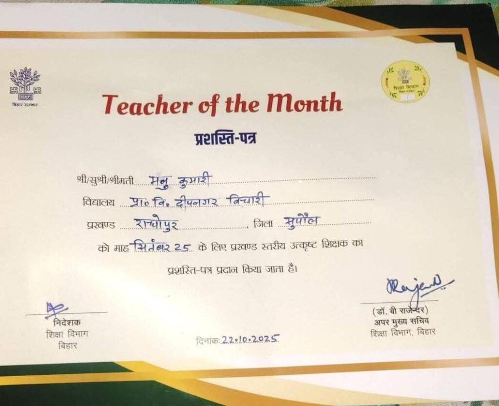 शिक्षा विभाग (बिहार सरकार) के अपर मुख्य सचिव डॉ. बी. राजेन्द्र के हस्ताक्षर से जारी यह प्रशस्ति पत्र Teacher of the Month (Best Teacher Award) के रूप में मनु कुमारी को उत्कृष्ट शिक्षण कार्य के लिए प्रदान किया गया। यह सम्मान राज्य स्तर से हस्तांतरित होकर बीते शनिवार को सुपौल में एमडीएम पंकज कुमार सिंह और डीपीओ आलोक कुमार के द्वारा उन्हें सौंपा गया।
