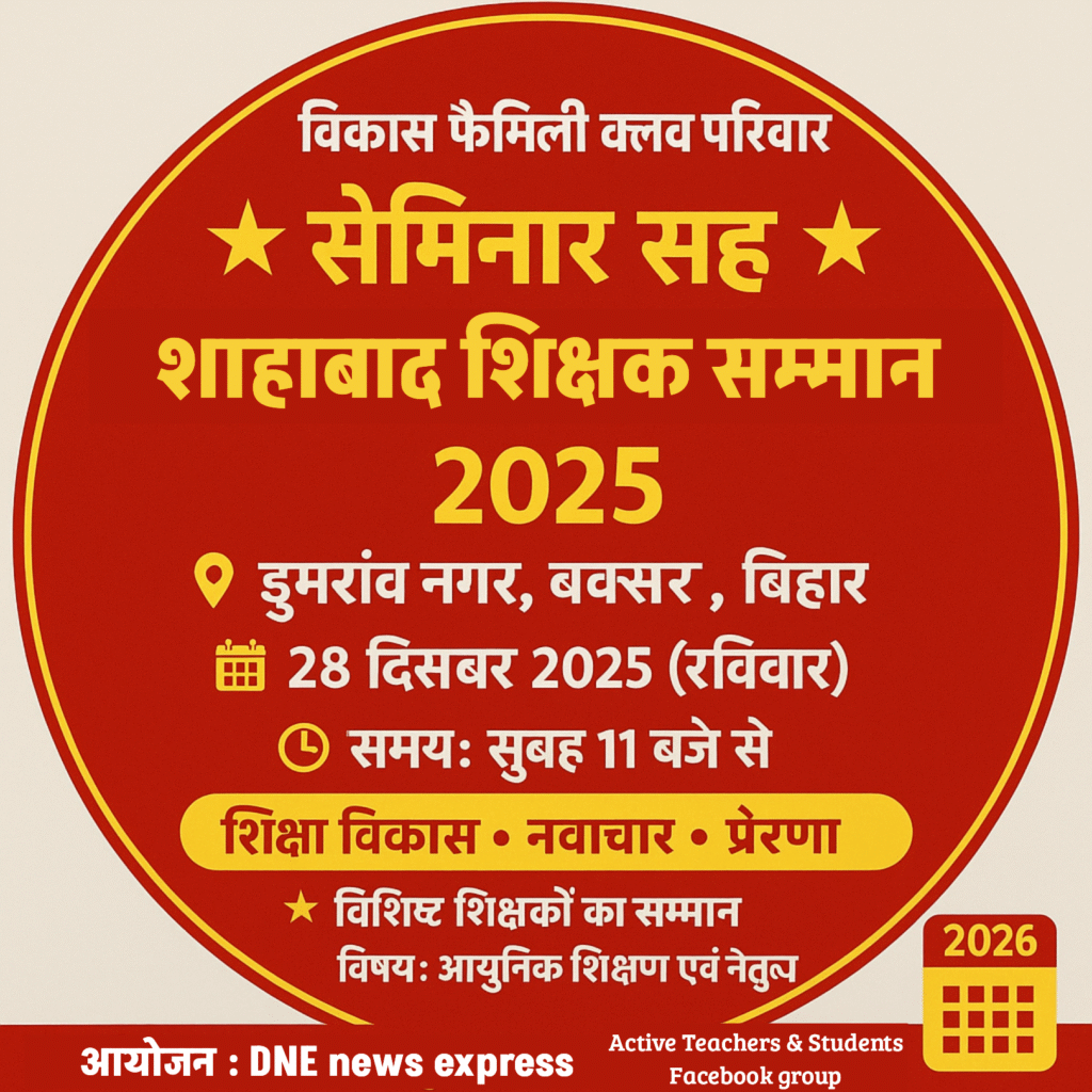 डुमरांव। शाहाबाद क्षेत्र में शिक्षा, पर्यावरण और विकास को केंद्रित करते हुए एक दिवसीय सेमिनार सह शाहाबाद शिक्षक सम्मान–2025 के आयोजन की तैयारी शुरू कर दी गई है। कार्यक्रम का आयोजन विकास फैमिली क्लब द्वारा किया जा रहा है, जो आगामी 28 दिसंबर को नगर स्थित एक स्थानीय हाल में आयोजित होगा। इस संबंध में जानकारी क्लब के निर्देशक मनोज मिश्रा एवं क्लब के मीडिया प्रभारी डॉ. संजय कुमार सिंह ने दी।